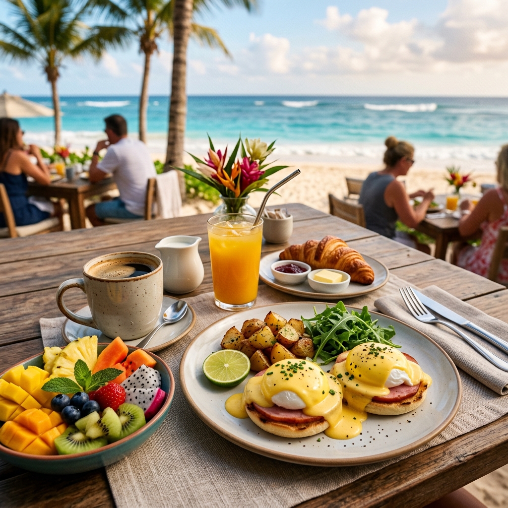 Eggs benedict, tropical fruits, fresh juice and coffee